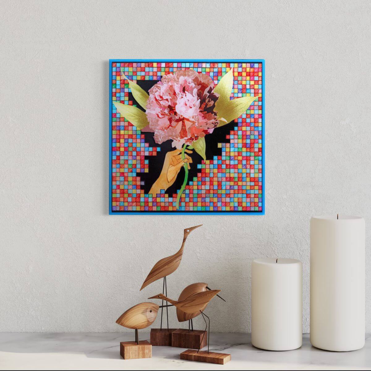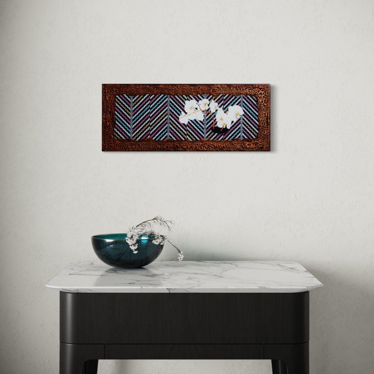 Filzstiftzeichnung mit Aquarell digital bearbeitet (Farbenversion) als Kunstdruck eingesetzt, auf Holz geklebt und mit Strukturpaste und Resinversiegelung bearbeitet