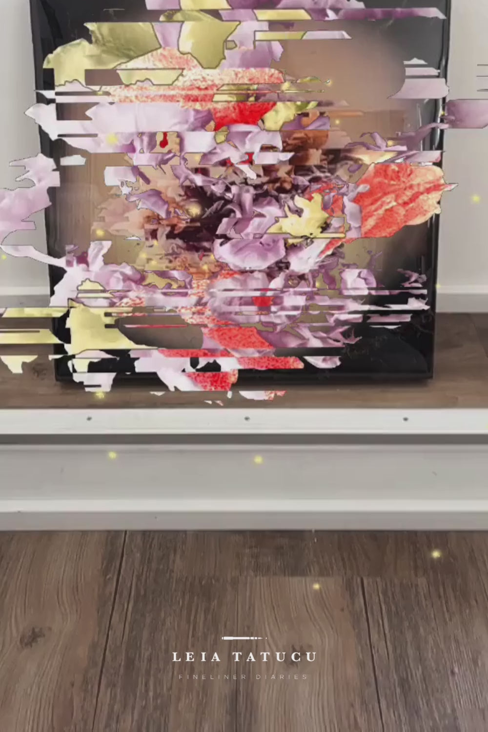 Lucrarea originală „Peony Glitch” este o operă de artă mixtă din rășină, constând într-un colaj al unei fotografii editate digital a unei flori de bujor, încorporat în multiple straturi de rășină turnată pe lemn vopsit cu spray acrilic și auriu. Aceasta este finisată cu un strat de sigilare din rășină transparentă, oferind un aspect elegant și o protecție durabilă.